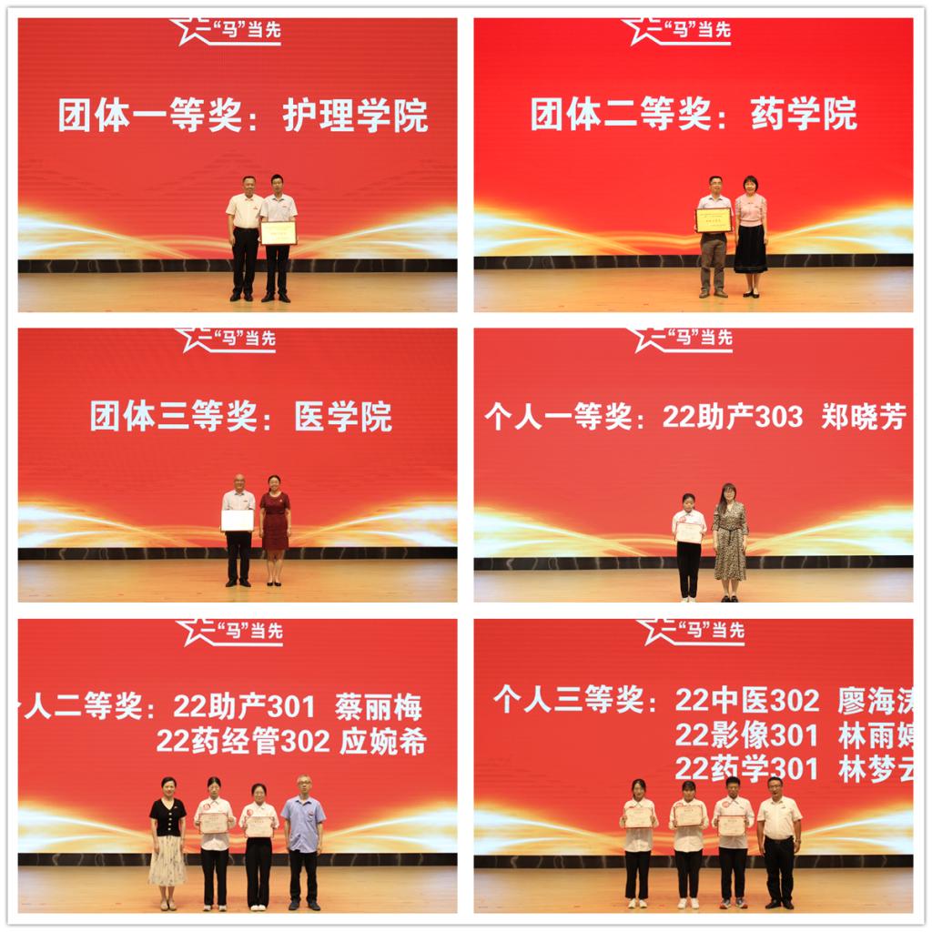 經(jīng)過激烈角逐,護(hù)理學(xué)院榮獲團(tuán)體一等獎,藥學(xué)院榮獲團(tuán)體二等獎,醫(yī)學(xué)院榮獲團(tuán)體三等獎。22助產(chǎn)303鄭曉芳獲得個人一等獎,22助產(chǎn)301蔡麗梅、22藥經(jīng)管302應(yīng)婉希獲得個人二等獎,22中醫(yī)302廖海濤、22影像301林雨婷、22藥學(xué)301林夢云獲得個人三等獎,22衛(wèi)管301鐘曉清等19名同學(xué)獲得個人優(yōu)勝獎。