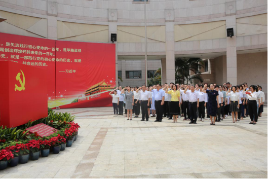 “奮斗百年路 啟航新征程?!痹趫A形廣場,院直機關(guān)黨總支組織黨員干部重溫入黨誓詞,面向鮮紅的黨旗莊嚴宣誓。