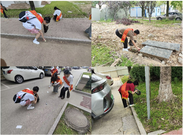 1點(diǎn)20分支部全體黨員、入黨積極分子在東南門廣場集合,黨支部書記彭琰為大家分發(fā)志愿者綬帶,明確分組事宜,由6名黨員老師帶領(lǐng)6個(gè)勞動(dòng)小組開展勞動(dòng)。
