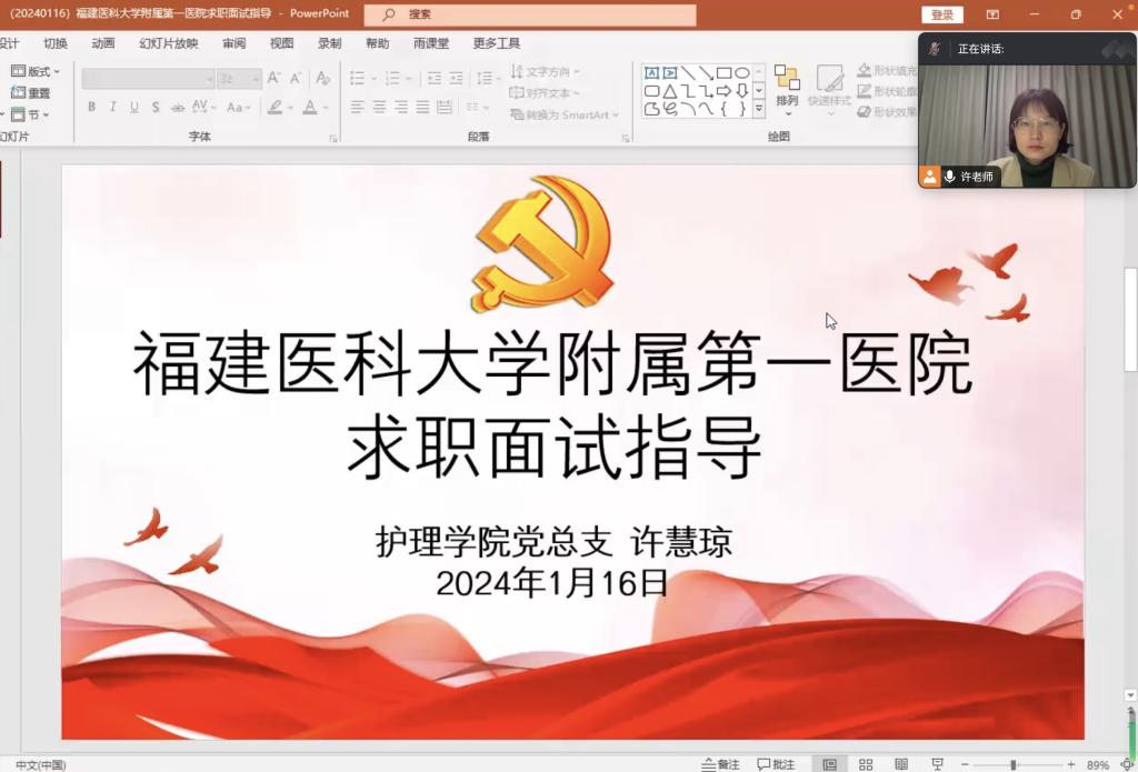 為進一步加強畢業(yè)生就業(yè)指導(dǎo)與服務(wù)工作,提升就業(yè)競爭力,認真落實“我為學(xué)生辦實事”,1月16日晚,護理學(xué)院學(xué)生第一黨支部通過騰訊會議開展福建醫(yī)科大學(xué)附屬第一醫(yī)院求職面試指導(dǎo)講座,著力解決學(xué)生最關(guān)心、最直接、最現(xiàn)實的問題。本次培訓(xùn)由黨總支專職組織員許慧瓊主講,130多位同學(xué)線上聆聽。