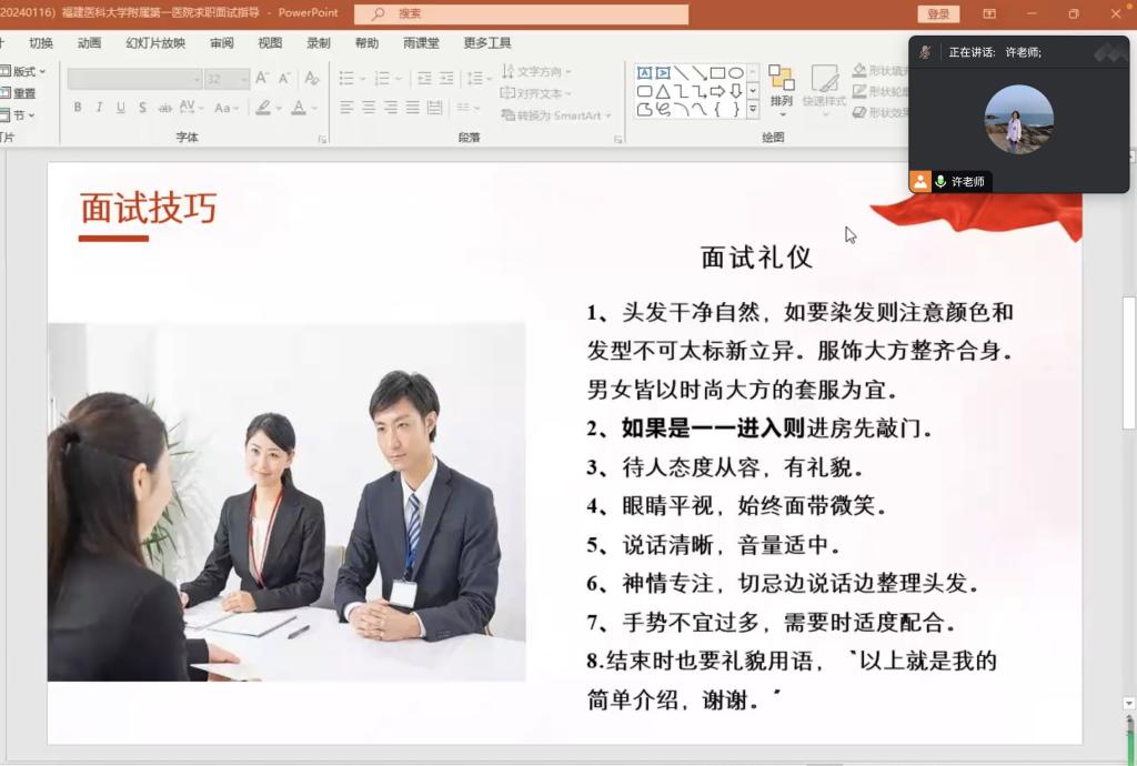 許慧瓊結(jié)合多年就業(yè)指導(dǎo)經(jīng)驗,從面試禮儀和面試自我介紹兩方面詳細為進入福建醫(yī)科大學(xué)附屬第一醫(yī)院招聘考試面試環(huán)節(jié)同學(xué)深入講解面試技巧。