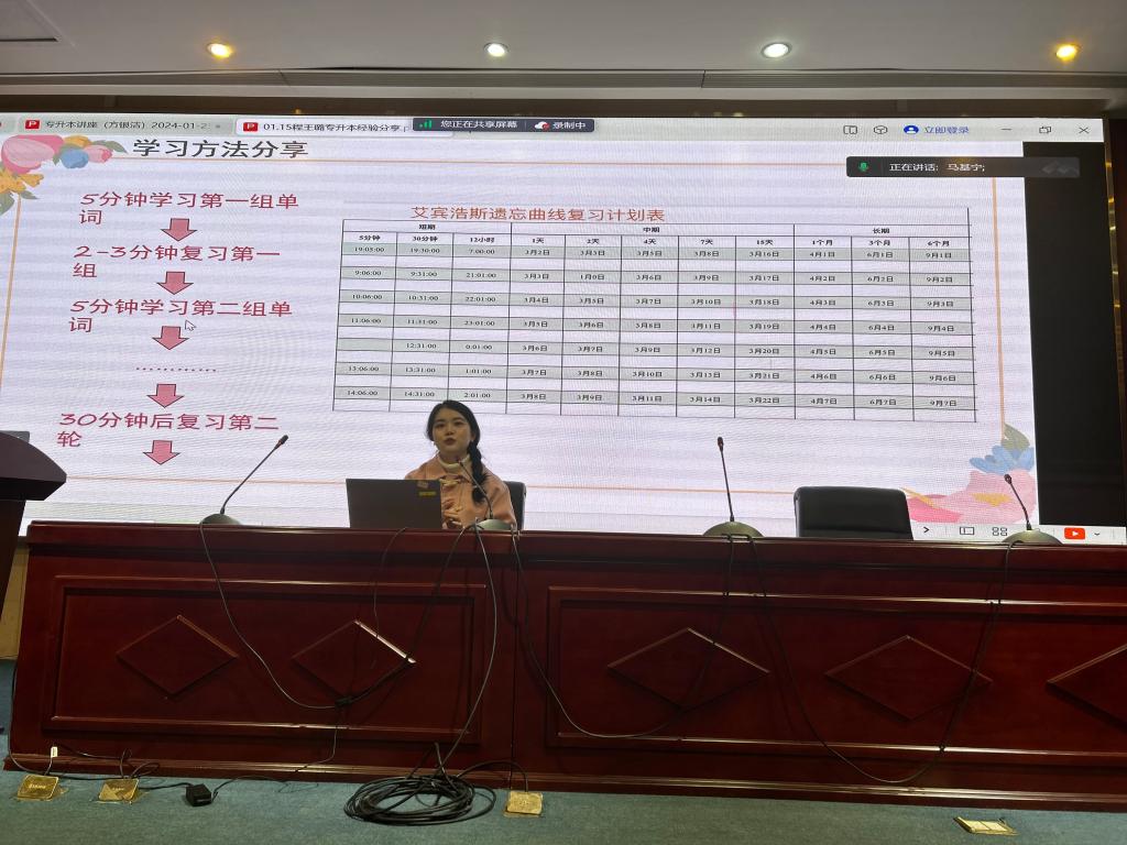 接著,程王璐向?qū)W弟學(xué)妹們分享復(fù)習(xí)時(shí)間安排、制定具體的復(fù)習(xí)計(jì)劃經(jīng)驗(yàn),結(jié)合艾賓浩斯的“遺忘曲線”做好復(fù)習(xí)的鞭策器。