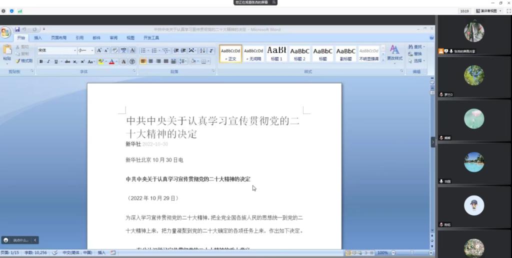 為進(jìn)一步準(zhǔn)確領(lǐng)會(huì)把握黨的二十大精神,切實(shí)把思想和行動(dòng)統(tǒng)一到貫徹落實(shí)黨的二十大精神上來(lái),藥學(xué)院第一黨支部線上開(kāi)展黨的二十大精神專題學(xué)習(xí)。