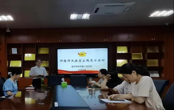 為提升支部黨員教師思想政治素質(zhì),全面加強(qiáng)師德師風(fēng)建設(shè),2023年9月21日,醫(yī)學(xué)院教師第三黨支部開展“師德師風(fēng)教育”主題黨日活動(dòng)?;顒?dòng)由支部書記陳銘主持。
