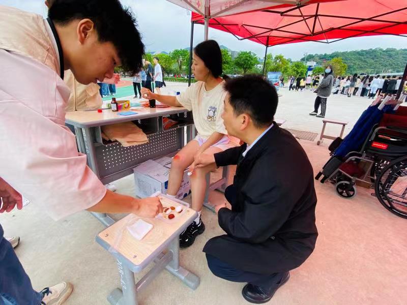 比賽期間,醫(yī)療隊(duì)黨員教師及紅十字會(huì)志愿者備好應(yīng)急醫(yī)療藥品時(shí)刻守護(hù)在賽場(chǎng)旁,對(duì)發(fā)生運(yùn)動(dòng)損傷的運(yùn)動(dòng)員第一時(shí)間進(jìn)行醫(yī)療救治。