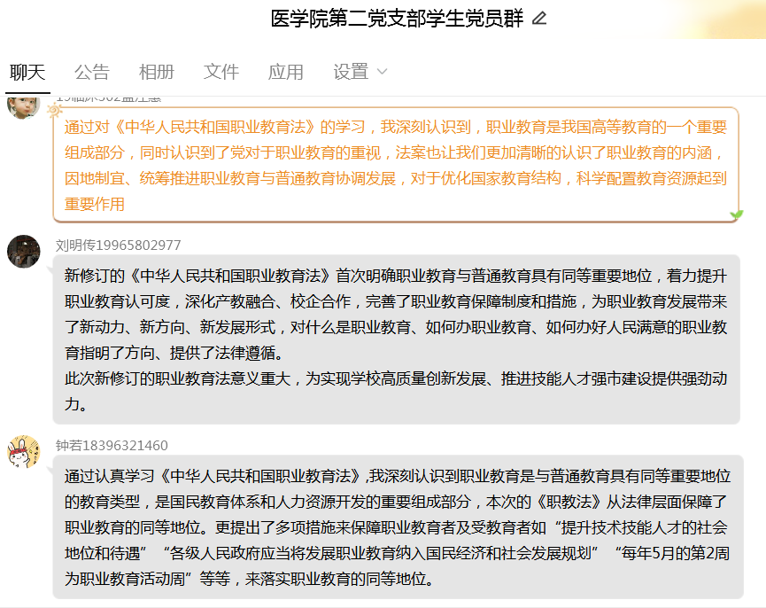 5月11日,醫(yī)學(xué)院第二黨支部采取線上線下相結(jié)合的方式,開(kāi)展“強(qiáng)學(xué)習(xí)、深思考、重提升--學(xué)習(xí)新修訂的《中華人民共和國(guó)職業(yè)教育法》”主題黨日活動(dòng),支部全體黨員、入黨積極分子共同參加了此次活動(dòng)。