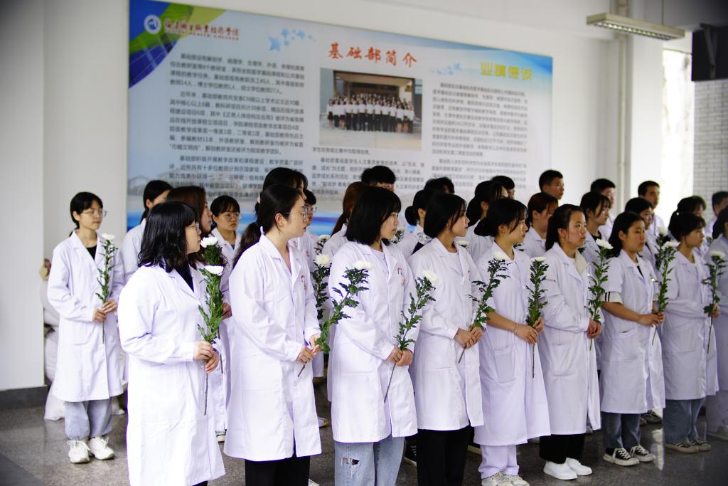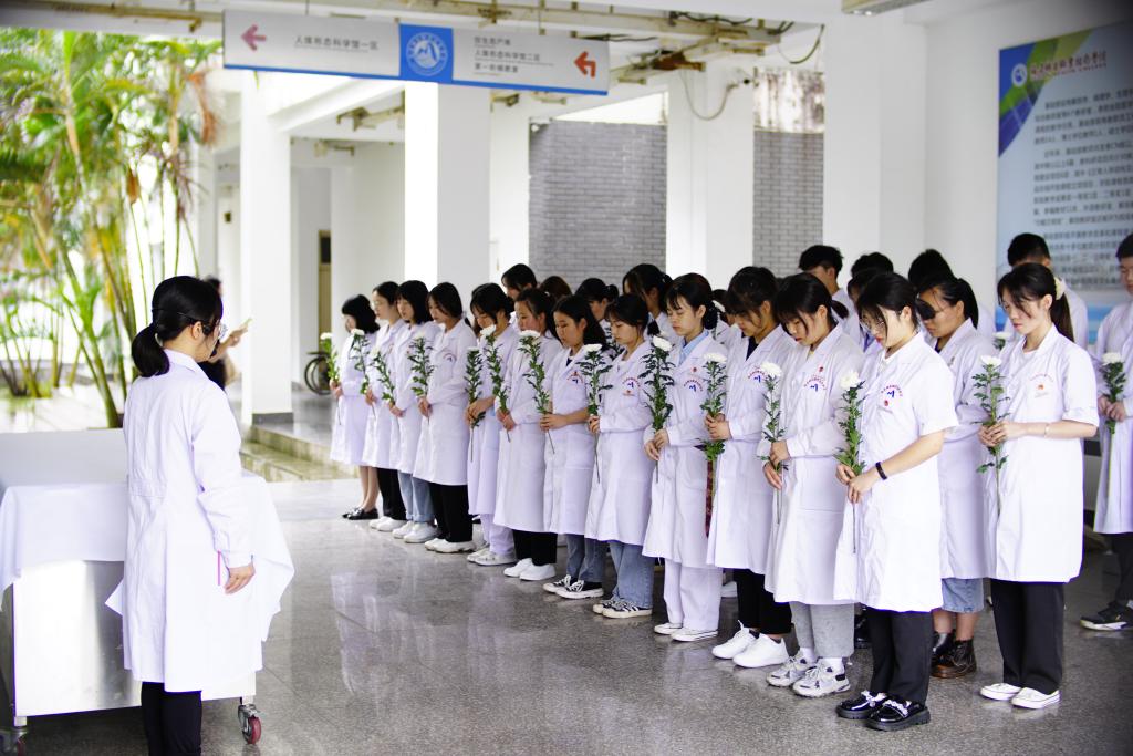 參加活動的師生集體行默哀禮,感恩無言良師,隨后大家向大體老師鞠躬并敬獻鮮花,表達敬意與追思。