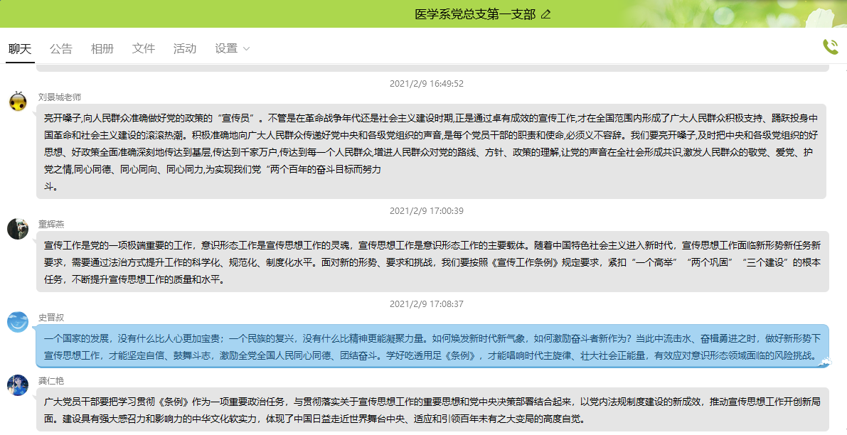 為提高全體黨員的政治意識和宣傳工作水平,2月9日下午,醫(yī)學(xué)系第一黨支部組織全體黨員開展線上學(xué)習(xí)《中國共產(chǎn)黨宣傳工作條例》(以下簡稱《條例》)主題黨日活動,由支部書記朱翔同志主持。