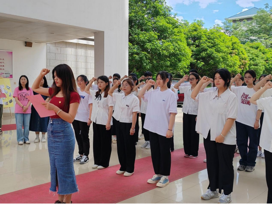 宣誓儀式在教學(xué)樓進(jìn)行,雄壯肅穆的國(guó)際歌聲拉開(kāi)儀式帷幕。林燕同志宣讀參加入黨宣誓儀式的預(yù)備黨員名單。在厲逢妹同志帶領(lǐng)下,預(yù)備黨員面向黨旗莊嚴(yán)宣誓。激昂的誓言字字千鈞,擲地有聲,久久回蕩,留下閩衛(wèi)院黨員學(xué)子的忠誠(chéng)承諾。