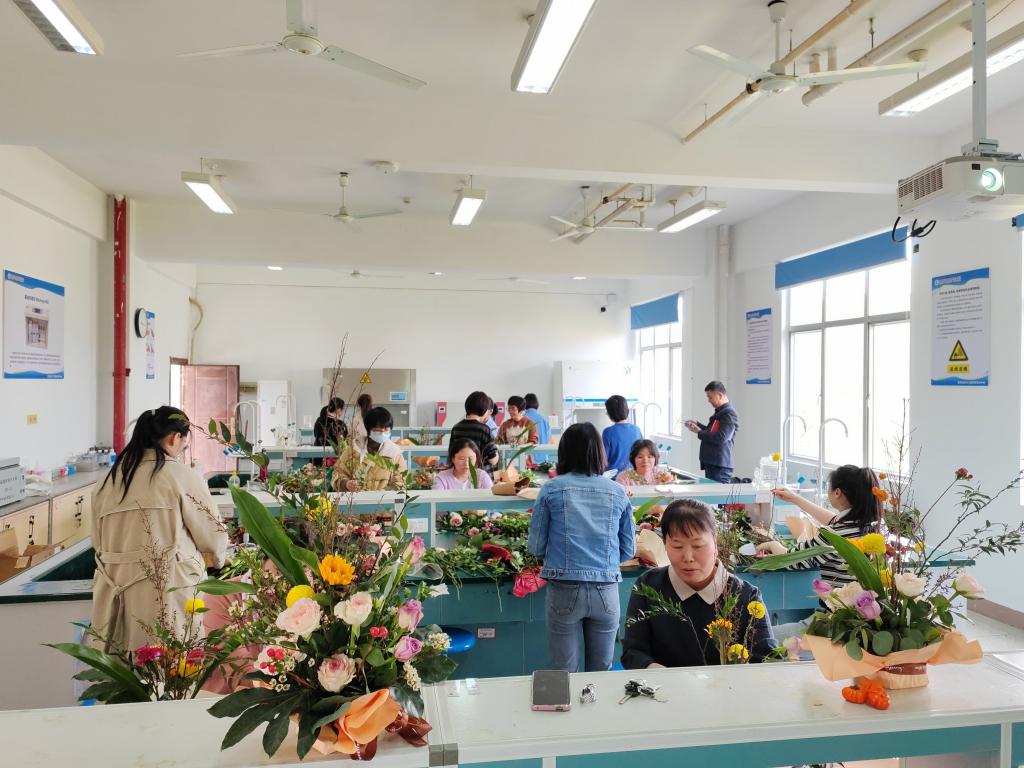 參與活動的教職工們邊學(xué)習(xí)邊創(chuàng)作,把玫瑰花、向日葵、球菊、桔梗、萬年青、燈籠果等花木枝葉精心修剪,巧妙搭配,創(chuàng)意組合。一束束別出心裁的插花作品在專業(yè)授課老師的指導(dǎo)下逐漸完工。