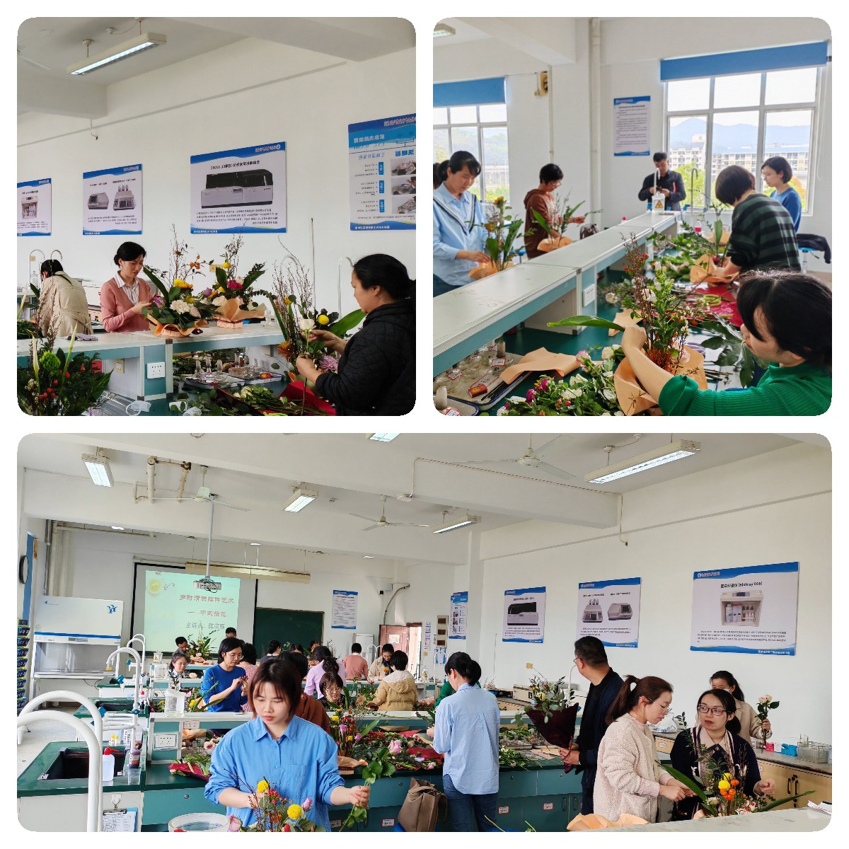 活動現(xiàn)場芬芳沁人心脾,讓人仿佛置身一片花海。教職工們一起聞著花香,互相討論插花心得,交流新學(xué)期工作和生活安排,洋溢著溫馨氛圍。