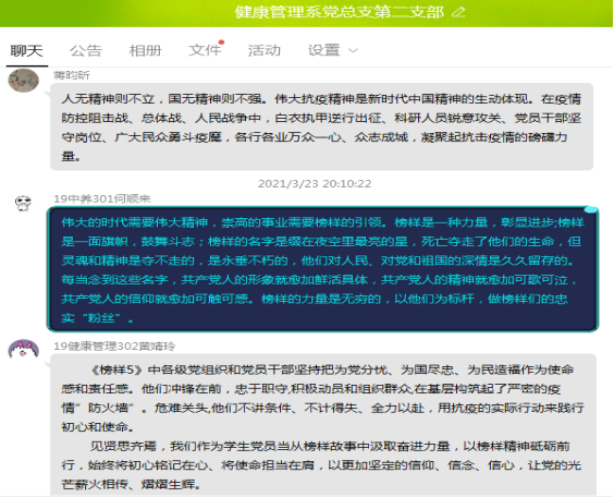 為宣傳偉大抗疫精神,集中展現(xiàn)新冠肺炎疫情防控阻擊戰(zhàn)中先進(jìn)基層黨組織和優(yōu)秀共產(chǎn)黨員風(fēng)采,深化拓展“不忘初心、牢記使命”主題教育成果,擴(kuò)大全國優(yōu)秀共產(chǎn)黨員和先進(jìn)基層黨組織評(píng)選表彰成效,營造團(tuán)結(jié)鼓勁、弘揚(yáng)正氣的濃厚氛圍,3月23日,健康管理系黨總支第二支部組織全體師生黨員在線收看《榜樣5》。