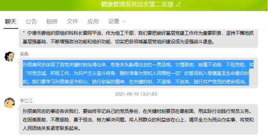 9月16日,健康管理系黨總支第二支部認(rèn)真?zhèn)鬟_(dá)學(xué)習(xí)《中共福建省委關(guān)于追授孫麗美同志“全省優(yōu)秀共產(chǎn)黨員”稱號(hào)并開(kāi)展向?qū)O麗美同志學(xué)習(xí)活動(dòng)的決定》。通過(guò)觀看專題節(jié)目《“八閩楷?!睂O麗美同志先進(jìn)事跡發(fā)布儀式》,節(jié)目介紹了孫麗美同志的感人事跡,黨員們被孫麗美同志先進(jìn)事跡深深感動(dòng)。