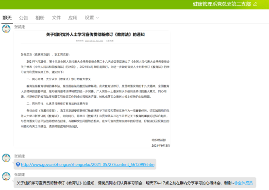 9月24日,健康管理系黨總支第二支部組織全體師生黨員開(kāi)展專題學(xué)習(xí)交流會(huì),學(xué)習(xí)新修訂的《中華人民共和國(guó)教育法》。會(huì)議由支部書(shū)記張凱捷主持。