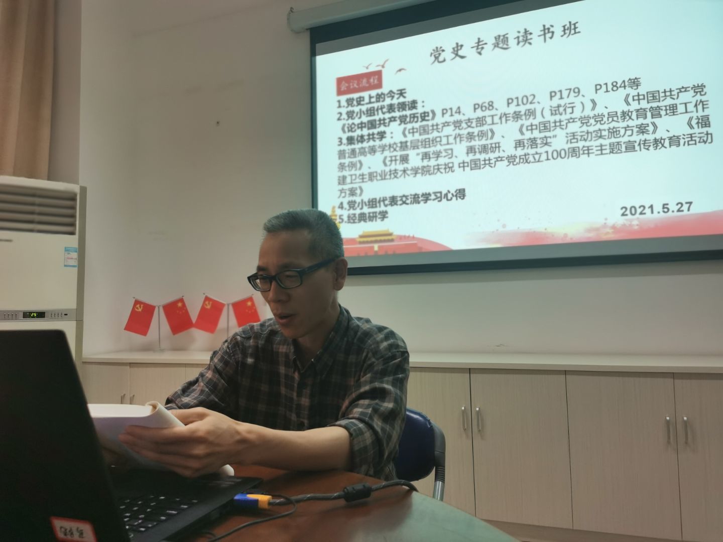 為深入學(xué)習(xí)黨史,傳承紅色基因,擔(dān)當(dāng)初心使命,2021年5月27日直屬馬克思主義學(xué)院黨支部第二黨小組在會議室107進(jìn)行黨史學(xué)習(xí)。學(xué)習(xí)活動由黨小組組長來朋珍主持。