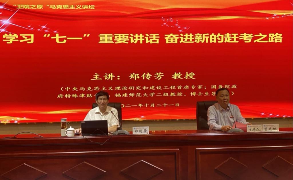 為深入學(xué)習(xí)宣傳貫徹“七一”重要講話精神,持續(xù)推進(jìn)黨史學(xué)習(xí)教育走深走實(shí),我校特邀中央馬克思主義理論研究和建設(shè)工程首席專家、福建師范大學(xué)鄭傳芳教授作題為《學(xué)習(xí)“七一”重要講話 奮進(jìn)新的趕考之路》的專題講座。講座由校黨委書記曾武祈主持,校領(lǐng)導(dǎo)、中層干部、思政課教師、校園網(wǎng)絡(luò)文化五支隊(duì)伍和醫(yī)學(xué)技術(shù)系等師生代表共120人參加。