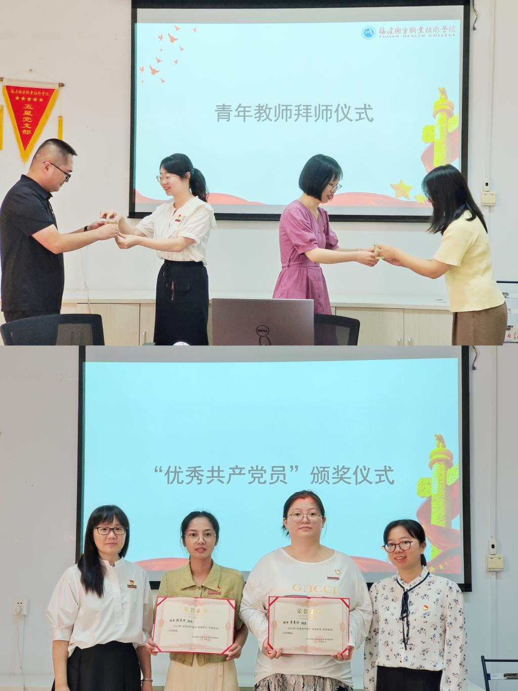 結(jié)合本次主題黨日活動主題,直屬馬克思主義學院黨支部開展了慶祝第39個教師節(jié)活動,全體黨員教師在黨支部書記熊美蘭的帶領(lǐng)下,共同立下錚錚誓言,牢記習近平總書記殷殷囑托,牢牢扛起光榮使命。為充分發(fā)揮優(yōu)秀骨干教師對青年教師的傳、幫、帶作用,使青年教師盡快成長,馬院舉行青年教師拜師儀式,鄒亞彤、劉宗永兩位新進教師分別向?qū)焸兙床?、拜師。黨支部書記熊美蘭、副書記賴文金分別為獲得2023年“優(yōu)秀共產(chǎn)黨員”的張茵珠、曾美玲兩位同志頒獎,希望受到表彰的同志珍惜榮譽、發(fā)揚成績,爭取更大光榮。榮獲“三育人先進工作者”的張茵珠老師作了交流分享,她表示在今后的工作中會更加積極配合,少點借口、計較,多點認真、用心,力爭取得更好地成績。