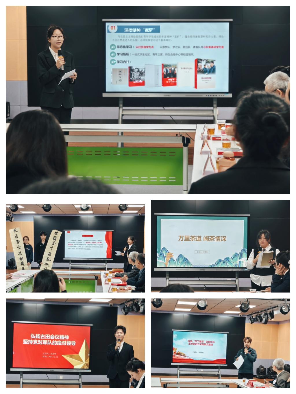 習(xí)近平總書(shū)記在福建工作期間開(kāi)創(chuàng)了豐富的思想財(cái)富、精神財(cái)富和實(shí)踐成果,為福建建設(shè)指明了前進(jìn)方向。讀書(shū)社圍繞這些財(cái)富與成果開(kāi)展一系列社團(tuán)活動(dòng),采擷歸來(lái),阮昱銘、陳泌達(dá)、張晶鈺、鄭佳銘等讀書(shū)社骨干社員分別作題為《弘揚(yáng)古田會(huì)議精神 堅(jiān)持黨對(duì)軍隊(duì)的絕對(duì)領(lǐng)導(dǎo)》《傳承紅醫(yī)精神 賡續(xù)紅色血脈》《萬(wàn)里茶道 閩茶情深》《發(fā)揚(yáng)“四下基層”優(yōu)良作風(fēng) 走好新時(shí)代黨的群眾路線》的學(xué)習(xí)分享。他們從不同視角,用青年話語(yǔ),以小見(jiàn)大解讀習(xí)近平總書(shū)記在福建的探索與實(shí)踐,暢談從中汲取到的成長(zhǎng)力量。讀書(shū)社社長(zhǎng)江月婧從“深挖精神‘富礦’”“深植理論宣傳”“深耕社會(huì)實(shí)踐”等三方面總結(jié)讀書(shū)社作為省級(jí)理論社團(tuán)建設(shè)情況,以“學(xué)習(xí)、傳播、實(shí)踐”三條路徑匯報(bào)讀書(shū)社在校內(nèi)外、在“一站式”社區(qū)開(kāi)展的系列活動(dòng)。