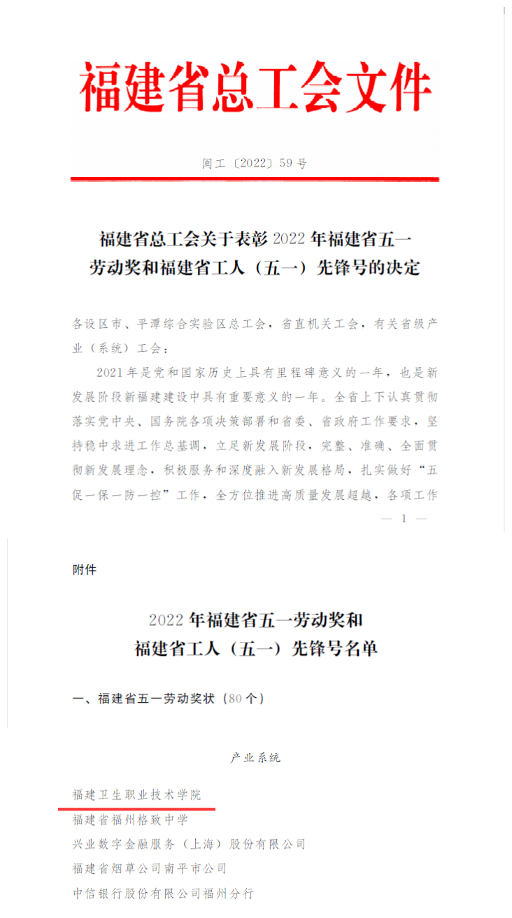近日,福建省總工會(huì)印發(fā)《關(guān)于表彰2022年福建省五一勞動(dòng)獎(jiǎng)和福建省工人(五一)先鋒號(hào)的決定》,我校榮獲福建省五一勞動(dòng)獎(jiǎng)狀,是福建省唯一獲此殊榮的高校,也是唯一一所職業(yè)院校。