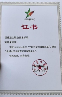 黃育豪,男,漢族,中共預(yù)備黨員,福建衛(wèi)生職業(yè)技術(shù)學(xué)院22級(jí)臨床醫(yī)學(xué)(高本貫通)602班學(xué)生,曾任班級(jí)副班長(zhǎng),現(xiàn)擔(dān)任福清市醫(yī)院實(shí)習(xí)隊(duì)長(zhǎng)。學(xué)習(xí)期間,先后獲得國(guó)家級(jí)、省級(jí)獎(jiǎng)項(xiàng)6項(xiàng)。近期,在由共青團(tuán)中央、中華全國(guó)學(xué)生聯(lián)合會(huì)指導(dǎo),中國(guó)青年報(bào)社、新東方教育科技集團(tuán)、中國(guó)青年創(chuàng)業(yè)就業(yè)基金會(huì)聯(lián)合開展的2023-2024年度“中國(guó)大學(xué)生自強(qiáng)之星”評(píng)選中榮獲“中國(guó)大學(xué)生自強(qiáng)之星”榮譽(yù)稱號(hào)。