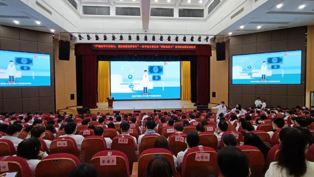 儀式在高亢嘹亮的國(guó)歌聲中拉開(kāi)序幕,隨后,領(lǐng)導(dǎo)、嘉賓和專(zhuān)業(yè)老師以掌心傳遞的方式點(diǎn)亮大屏幕,合力開(kāi)啟活動(dòng)周。師生們共同觀看《國(guó)際放射日》宣傳片,增強(qiáng)從事醫(yī)學(xué)影像工作的職業(yè)信念。