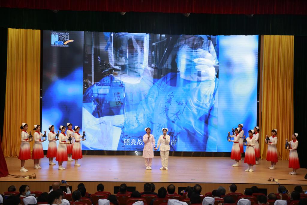 報(bào)告團(tuán)成員、首批援鄂醫(yī)療隊(duì)隊(duì)員林靜、藍(lán)鈺菱現(xiàn)場(chǎng)獻(xiàn)唱了《提燈女神》,婉轉(zhuǎn)深情的歌聲與視頻畫面回顧將報(bào)告會(huì)的氣氛推向高潮,在場(chǎng)師生無(wú)不被醫(yī)療隊(duì)“敬佑生命、救死扶傷、甘于奉獻(xiàn)、大愛無(wú)疆”的醫(yī)學(xué)精神深深感動(dòng)。
