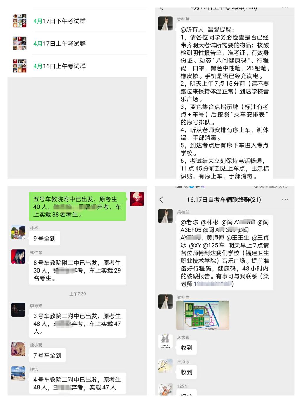 本次考試是3月疫情以來的第一場大考,鑒于當前疫情防控要求,為減少學生考試途中的人員接觸風險,保障校內考生順利參加考試,繼續(xù)教育學院聯(lián)合學生工作部、護理學院成立專項工作組,主動對接福州教育學院第二附屬中學等7個考點,精心組織10部客車,為400余名2020、2021級校內考生提供專車接送服務。