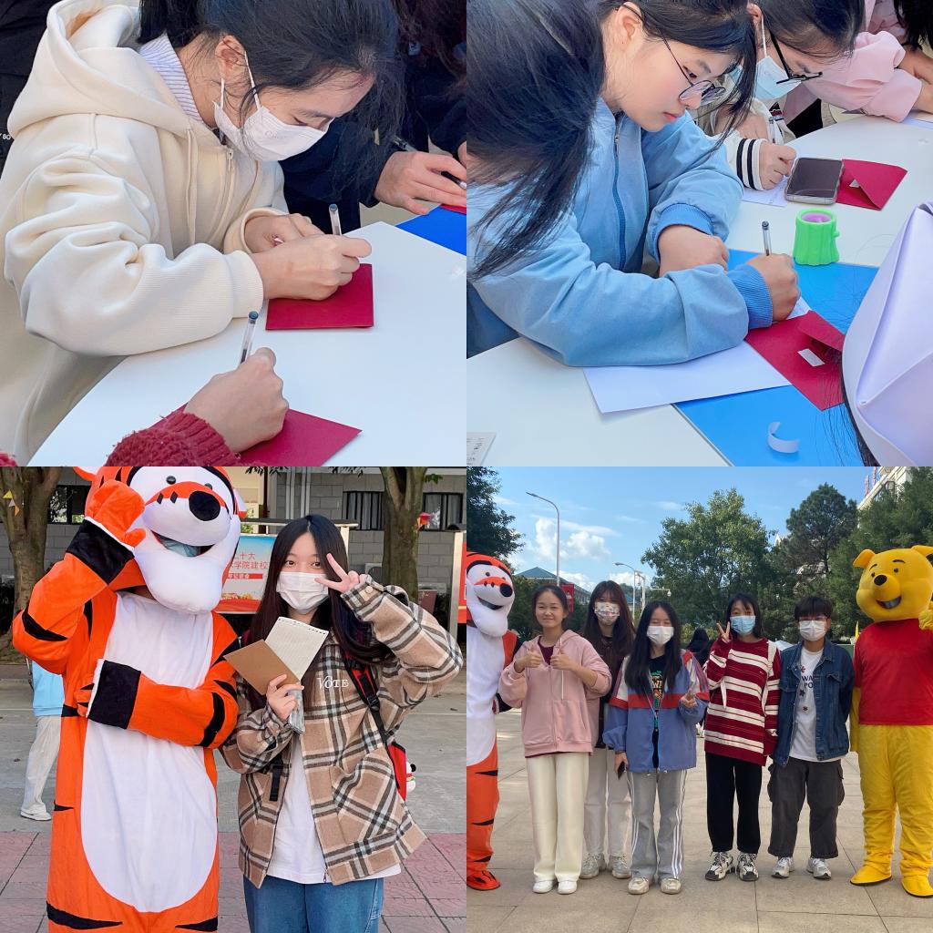 作為系列活動(dòng)之一,心理健康教育中心面向全校學(xué)生舉辦了“寄語(yǔ)成長(zhǎng),共話未來”——給未來一封信活動(dòng),旨在幫助同學(xué)們規(guī)劃自己未來的道路,用現(xiàn)在的角度暢想未來,用未來的角度反思自己,不忘初心?;顒?dòng)現(xiàn)場(chǎng)還安排了可愛的人偶與同學(xué)們進(jìn)行“暖心擁抱”并拍照,用溫暖的擁抱消除同學(xué)們的疲憊與煩惱。