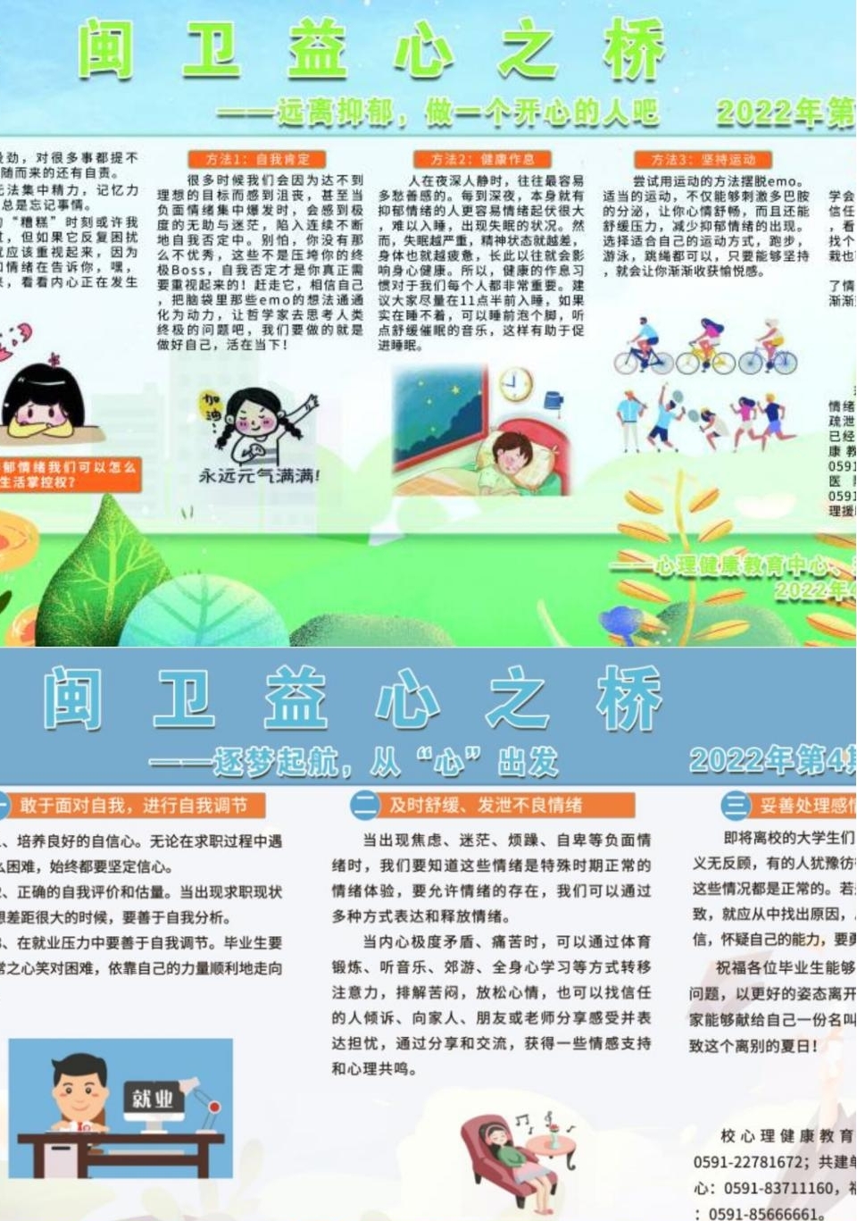我校心理健康教育中心根據(jù)疫情防控期間學(xué)生學(xué)習(xí)、生活、工作狀態(tài)等需要,結(jié)合學(xué)生的實(shí)際心理需求,撰寫相關(guān)心理宣傳文章,每月定期更新學(xué)校心理健康教育中心宣傳欄《閩衛(wèi)益心之橋》。本學(xué)期共發(fā)布《從“心”開始,向陽(yáng)而生》《健康心理,快樂成長(zhǎng)》等4期宣傳文章。同時(shí),在閩衛(wèi)院心理健康教育中心QQ《益心領(lǐng)讀》專欄分享心理成長(zhǎng)類書籍,帶動(dòng)身邊的人愛讀書、會(huì)讀書、有書讀,引導(dǎo)學(xué)生學(xué)習(xí)相關(guān)心理知識(shí),培養(yǎng)閱讀養(yǎng)心、健心的習(xí)慣,促進(jìn)學(xué)生成長(zhǎng)成才。目前欄目已發(fā)布《好心情手冊(cè)》《內(nèi)向性格的競(jìng)爭(zhēng)力》等6篇領(lǐng)讀文章。