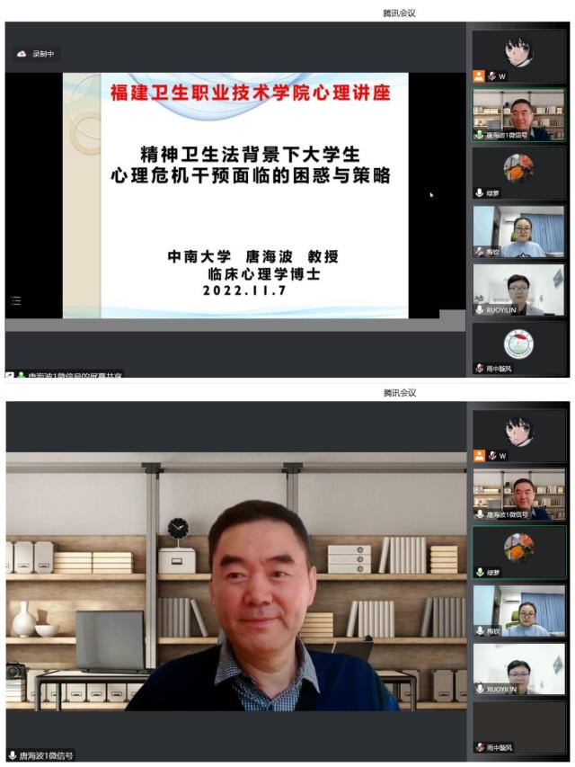 為幫助我校在疫情期間更好地開展心理危機(jī)干預(yù)工作,加強(qiáng)大學(xué)生心理健康教育,11月7日,我校特邀中南大學(xué)心理健康教育與咨詢專家、臨床心理學(xué)博士、中國(guó)心理學(xué)會(huì)臨床與咨詢心理學(xué)注冊(cè)心理督導(dǎo)師唐海波教授,面向全體輔導(dǎo)員、心理咨詢師及教師開展“精神衛(wèi)生法背景下大學(xué)生心理危機(jī)干預(yù)策略”主題講座,與大家一起進(jìn)入和探討學(xué)生的內(nèi)心世界,幫助同學(xué)們走出心靈困境。