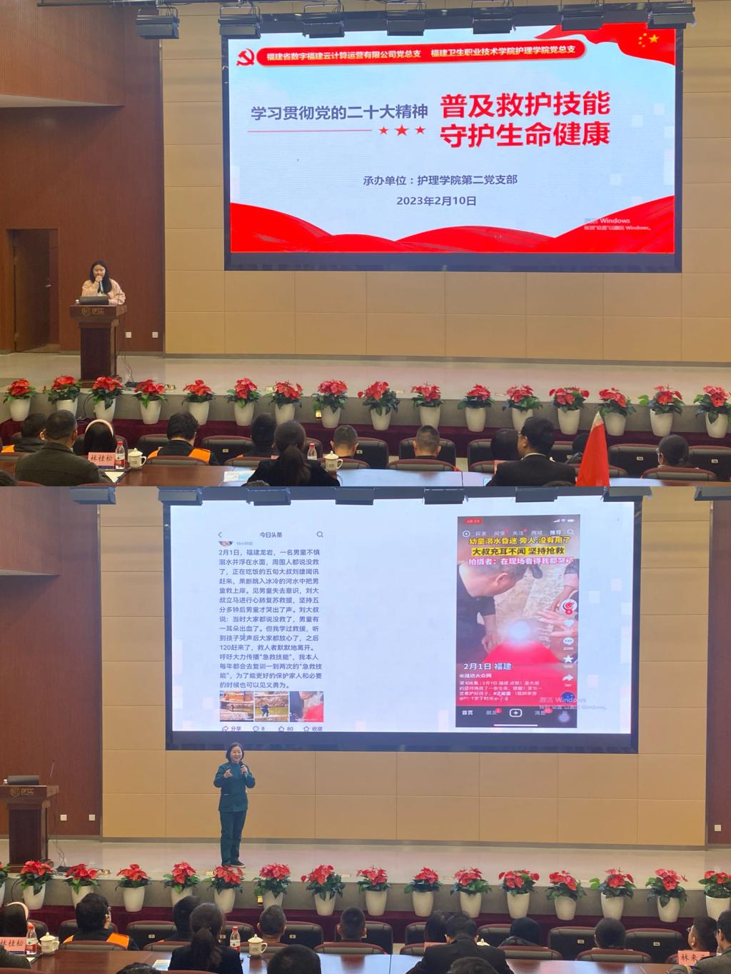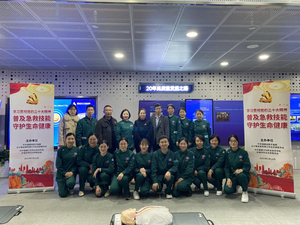 為進一步普及應急救護常識,提高全民自救互救能力,樹立“人人學急救,急救為人人”的理念。2月10日,護理學院黨總支副書記、院長龔海蓉一行帶領第二黨支部全體黨員教師走進黨建共建單位數字福建云計算中心,開展“學習貫徹黨的二十大精神 普及急救技能 守護生命健康”的主題黨日活動,數字福建云計算中心董事長郭孔武、總經理陳莉琳等120余名員工參加本次培訓。