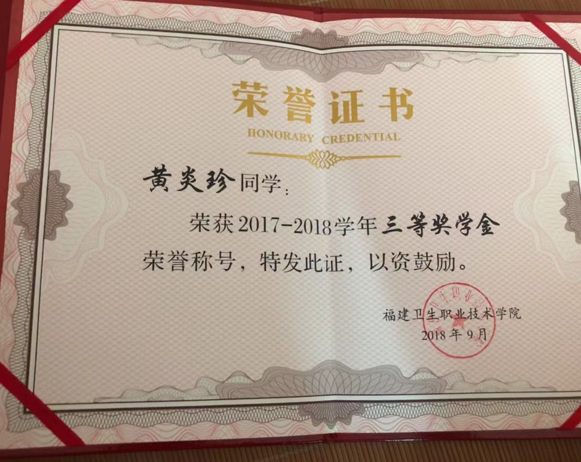 在大學期間,黃炎珍總是以飽滿的熱情迎接生活及學業(yè)的挑戰(zhàn),她目標明確,憑借著勤奮刻苦的學習態(tài)度和追求卓越的強大動力取得了優(yōu)異成績,榮獲2017-2018學年“三等獎學金”、2017-2018學年“優(yōu)秀學生干部”等榮譽。