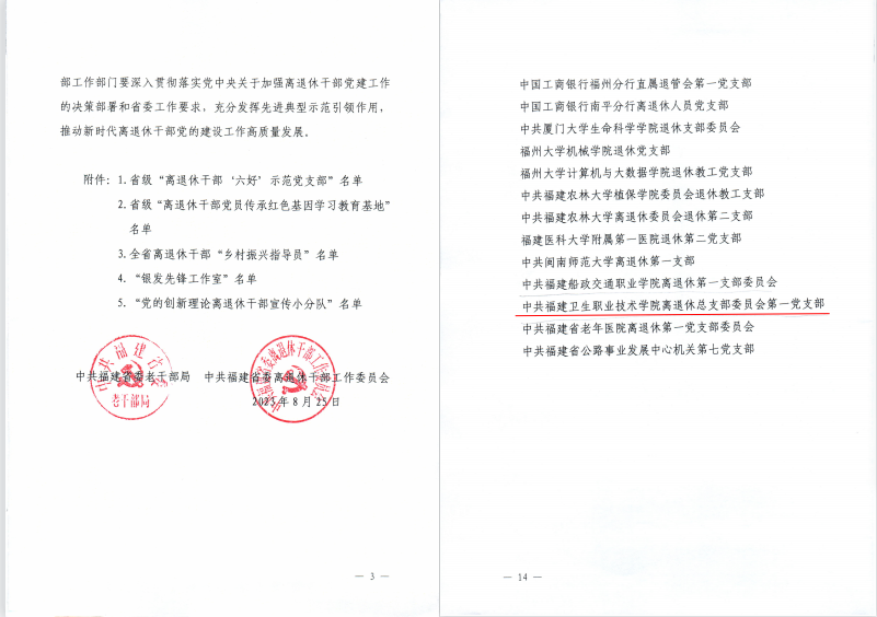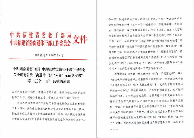 日前,中共福建省委老干部局、中共福建省委離退休干部工作委員會公布了2023年省級“離退休干部‘六好’示范黨支部”等“五個(gè)一百”名單,我校離退休黨總支第一黨支部首次被確定為省級“離退休干部‘六好’示范黨支部”,推動學(xué)校離退休干部黨建工作邁上新臺階。