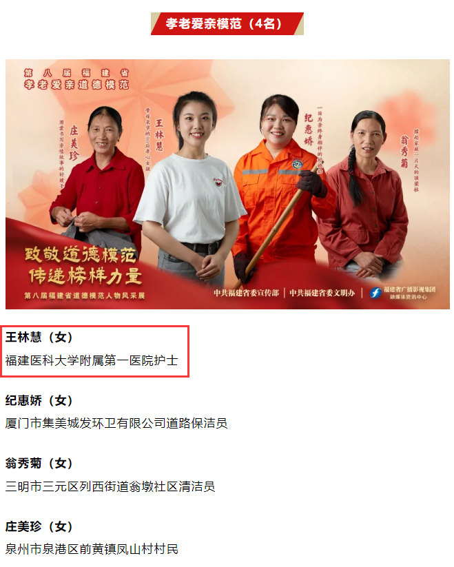 近日,福建省精神文明建設(shè)指導(dǎo)委員會(huì)印發(fā)《關(guān)于表彰第八屆福建省道德模范的決定》,我校22屆護(hù)理專業(yè)校友王林慧獲“孝老愛(ài)親模范”榮譽(yù)稱號(hào)。