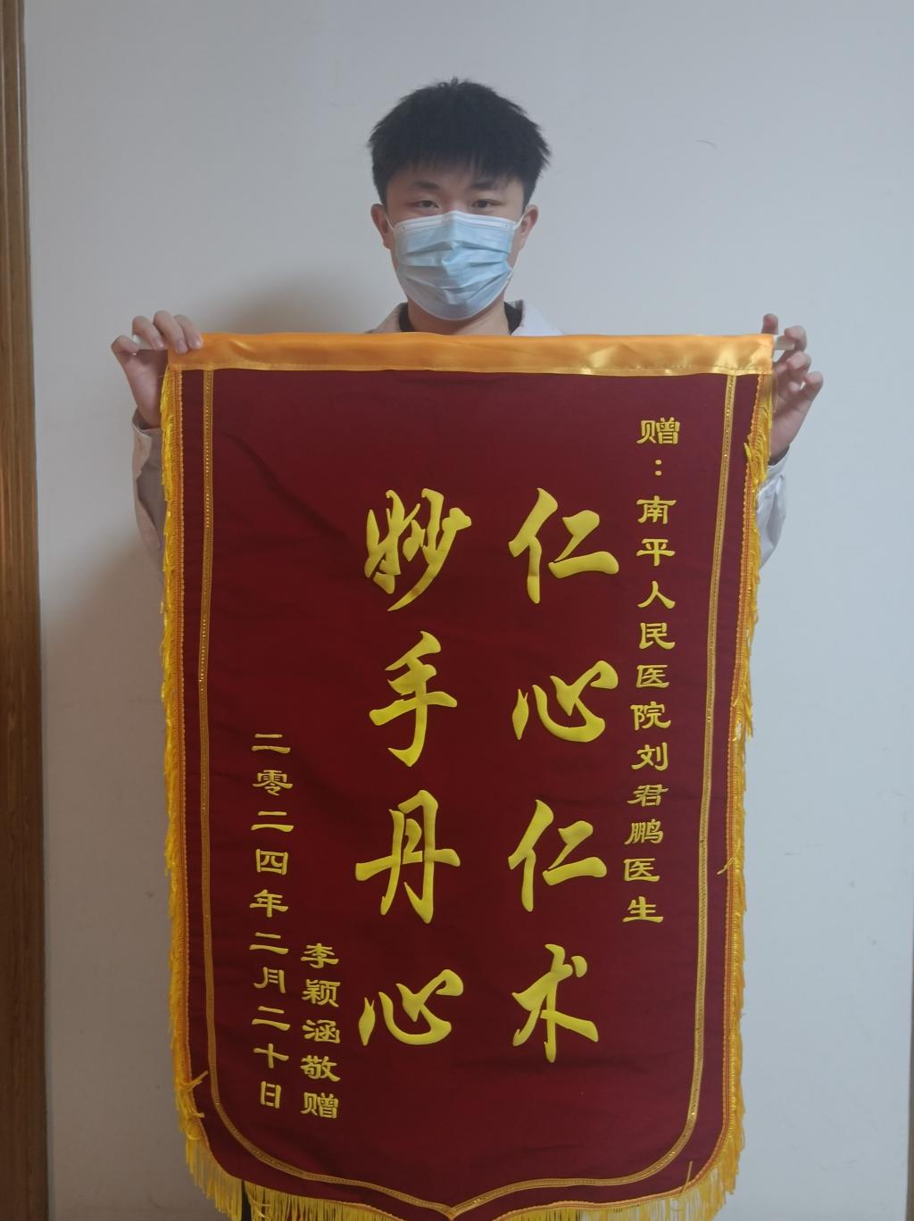 送錦旗的患者被腱鞘囊腫反復(fù)發(fā)作折磨一年余,同時伴有失眠、便秘,曾多方就醫(yī),治療效果均不明顯,遂至南平市人民醫(yī)院就診。治療期間,劉君鵬同學(xué)耐心疏導(dǎo)患者情緒,解釋病因病機,詳盡問診辨證論治。通過其細致嫻熟的針灸推拿手法,配合中藥治療,在短短一周后,患者可日行上萬步,同時睡眠、便秘問題也隨之解決。劉君鵬同學(xué)用仁心仁術(shù)幫助患者解決了困擾多時的難題,展現(xiàn)了閩衛(wèi)學(xué)子扎實過硬的專業(yè)能力和仁而愛人的醫(yī)者初心。