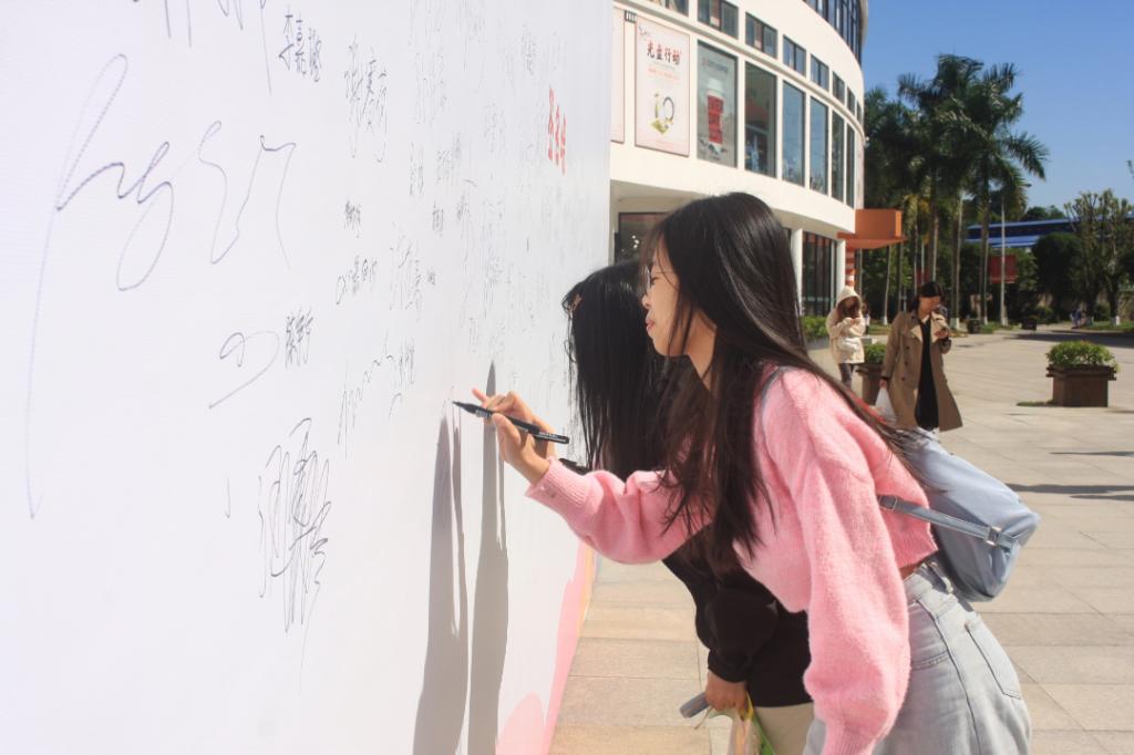 在簽名墻簽名合影和寫祝??ㄆ彩潜敬位顒拥囊淮罅咙c。師生們在簽名墻上留下自己的名字,并在祝??ㄆ蠈懴聦箵舭滩〉拿篮米T福栒俅蠹谊P(guān)愛、理解艾滋病人,正確防治艾滋病。