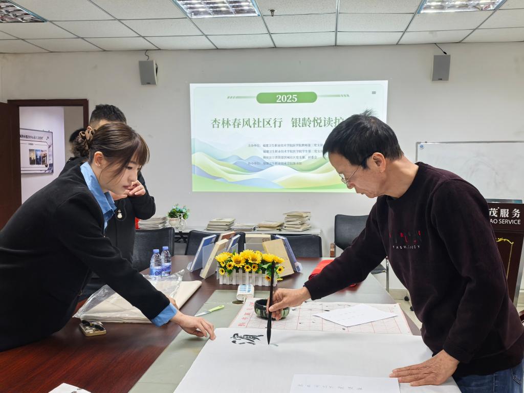 文化互動(dòng)環(huán)節(jié)同樣精彩紛呈。來(lái)自社區(qū)的老年書(shū)法家蕭惠敬揮毫潑墨,題字“濱城閩衛(wèi)共建健康,校社攜手同創(chuàng)福祉”展現(xiàn)了傳統(tǒng)文化的魅力。隨后,師生們與社區(qū)居民們共讀圖書(shū),分享閱讀心得,發(fā)表生活感悟,營(yíng)造了濃厚的文化氛圍。