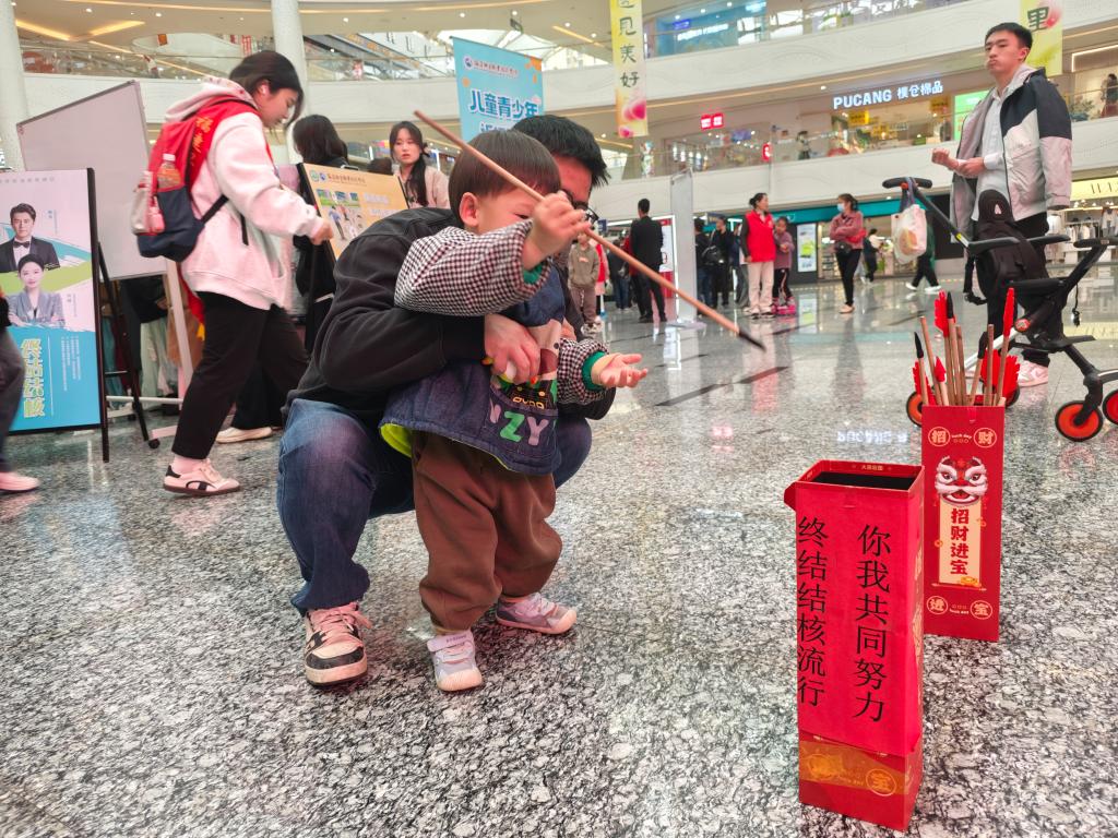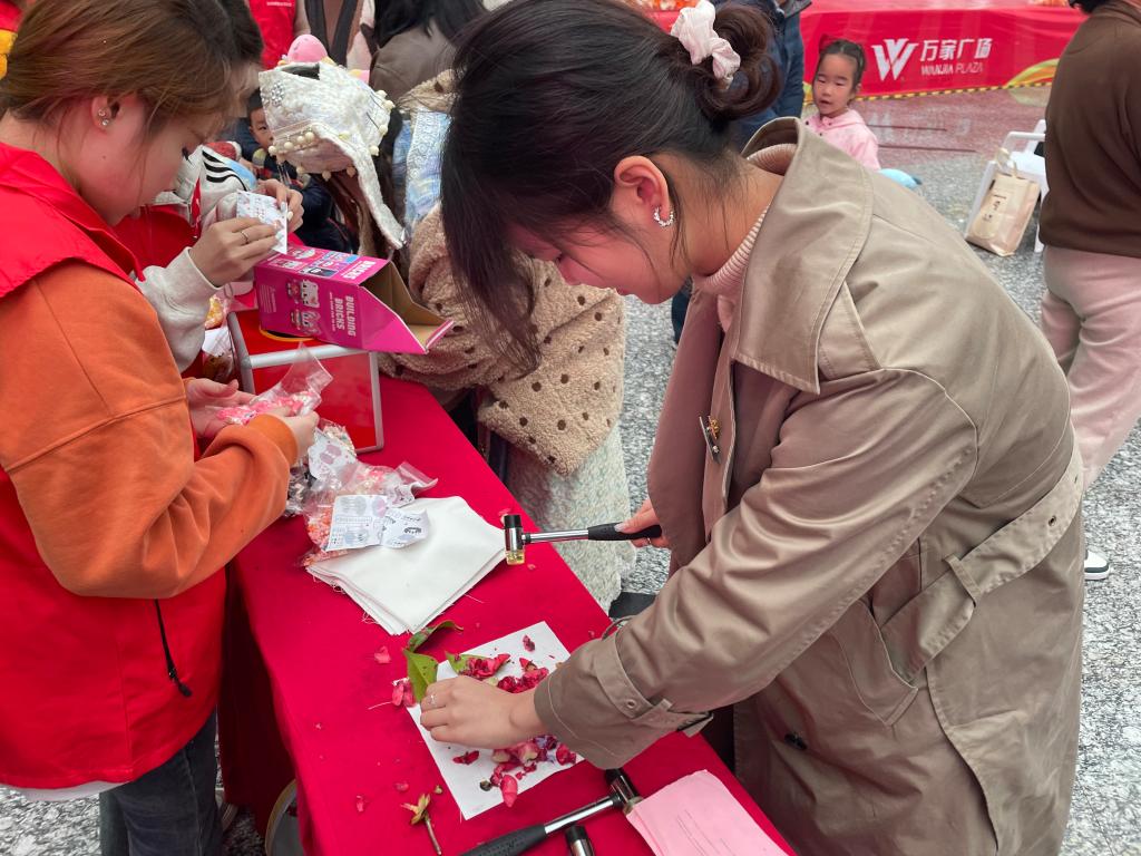舞臺下的游戲互動區(qū)與健康服務區(qū)也同樣精彩。志愿者們將結核防治核心知識巧妙融入游戲之中,設計了“直擊結核要害”投壺游戲、以結核防治為主題的“結核知識對對碰”繪畫活動、中醫(yī)(植物)拓印以及創(chuàng)意扭扭棒等互動游戲。