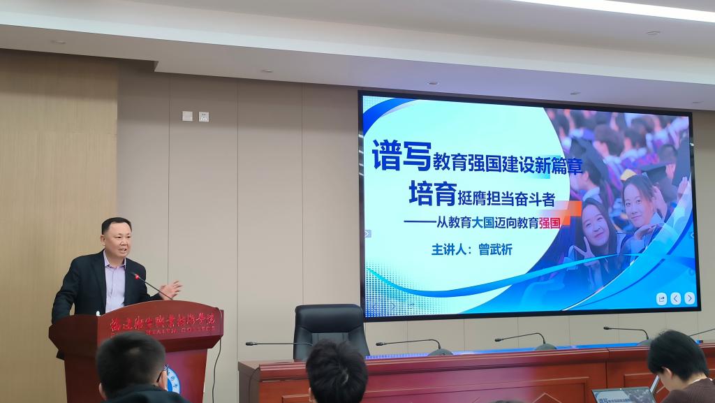 曾武祈以《譜寫教育強(qiáng)國(guó)建設(shè)新篇章 培育挺膺擔(dān)當(dāng)奮斗者——從教育大國(guó)邁向教育強(qiáng)國(guó)》為題,圍繞“堅(jiān)實(shí)基礎(chǔ) 戰(zhàn)略支撐”“蓬勃發(fā)展 優(yōu)質(zhì)均衡”“深化改革 系統(tǒng)推進(jìn)”“錨定目標(biāo) 篤行實(shí)干”四個(gè)維度系統(tǒng)闡釋了教育強(qiáng)國(guó)的戰(zhàn)略意義與實(shí)踐路徑。他強(qiáng)調(diào),建設(shè)教育強(qiáng)國(guó)是實(shí)現(xiàn)中華民族偉大復(fù)興的基礎(chǔ)工程,高校作為人才培養(yǎng)主陣地,要堅(jiān)持黨建引領(lǐng),將思政教育貫穿育人全過程,著力培養(yǎng) “政治堅(jiān)定、技術(shù)精湛、醫(yī)德高尚”的新時(shí)代醫(yī)藥衛(wèi)生人才。
