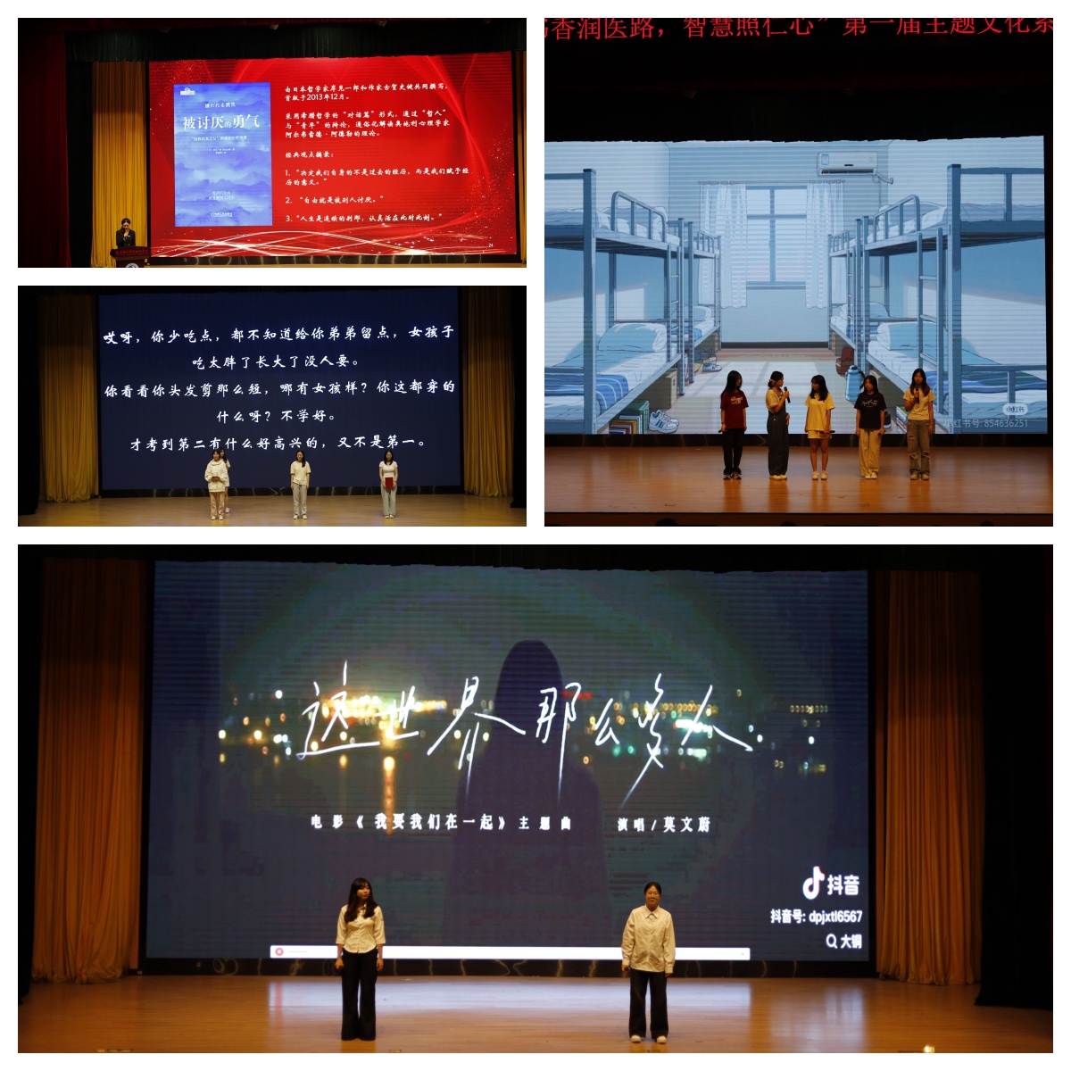 24檢驗(yàn)304班黃竹葉分享《被討厭的勇氣》,聚焦“課題分離”與“自我接納”,為青春困惑點(diǎn)亮明燈;宋沁萱、陳海心等帶來心理生活劇《二十不惑》,演繹大學(xué)生在迷茫中尋找方向的故事,引發(fā)“青春擺渡人”的溫暖共鳴;盧婷妤、張玉婷演唱《這世界那么多人》,以溫柔嗓音訴說相遇與陪伴的珍貴,讓現(xiàn)場(chǎng)沉浸于“溫暖與力量”的氛圍。