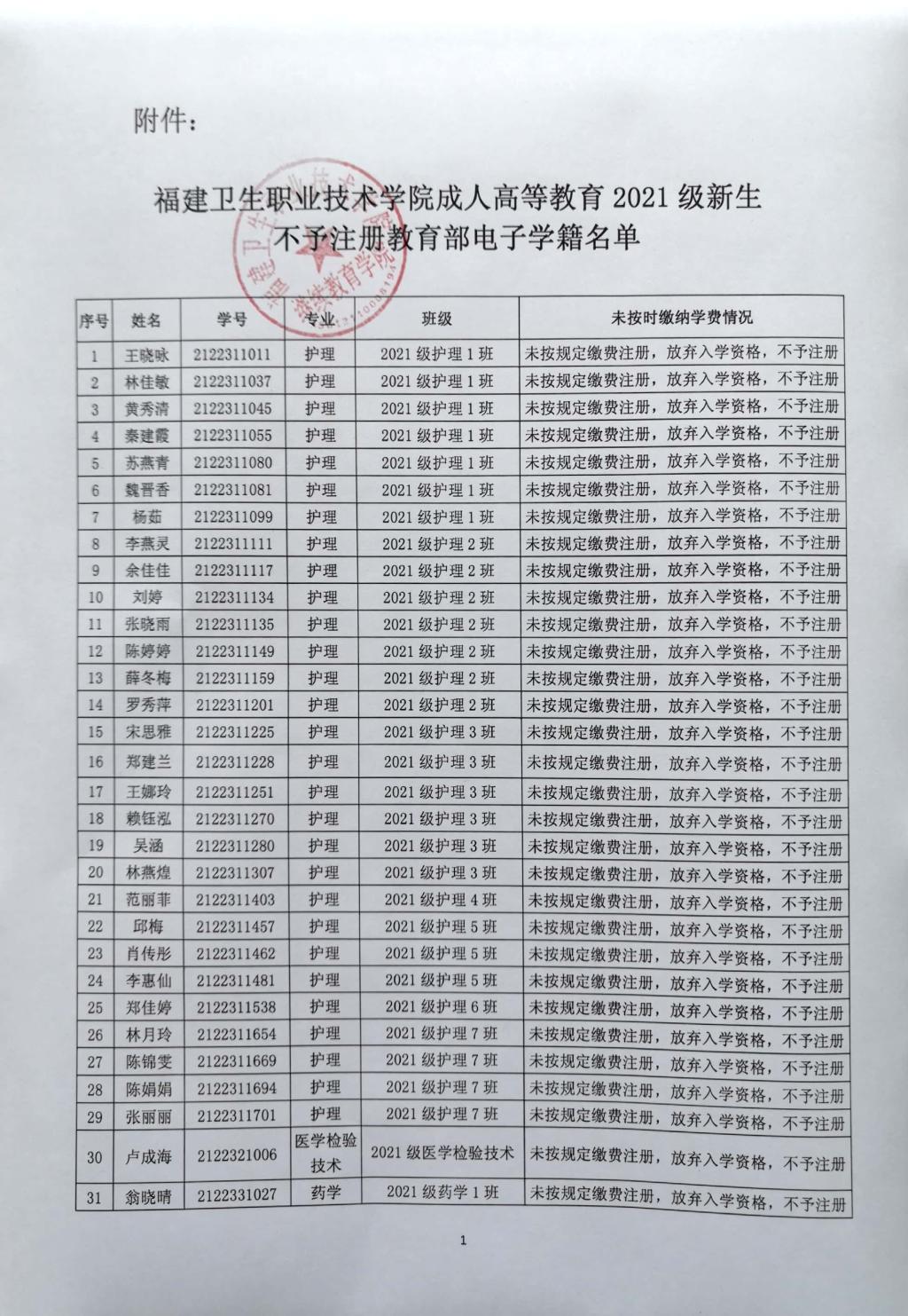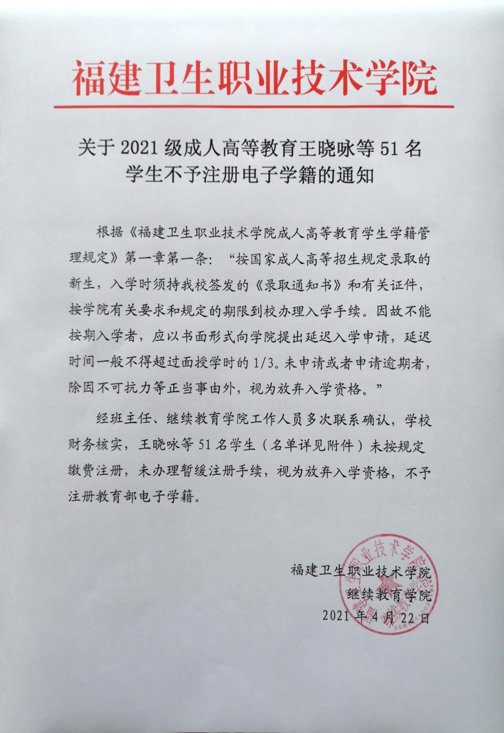 關(guān)于2021級成人高等教育王曉詠等51名學(xué)生不予注冊電子學(xué)籍的通知