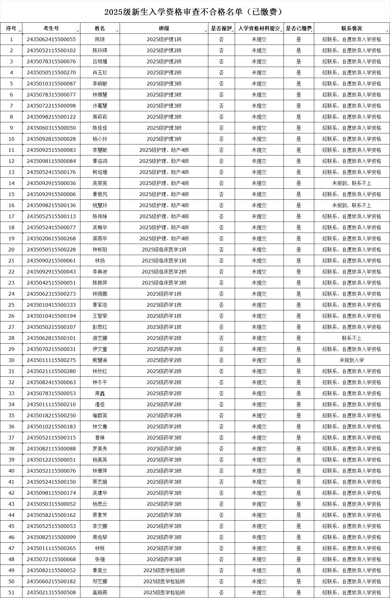 根據(jù)《福建衛(wèi)生職業(yè)技術(shù)學(xué)院高等學(xué)歷繼續(xù)教育學(xué)生學(xué)籍管理規(guī)定》第一章第一條規(guī)定:“按高校學(xué)歷繼續(xù)教育招生統(tǒng)一考試錄取的新生,入學(xué)時(shí)須持我校簽發(fā)的《錄取通知書》和有關(guān)證件,按學(xué)校有關(guān)要求和規(guī)定的期限到校辦理入學(xué)手續(xù)。因故不能按期入學(xué)者,應(yīng)以書面形式向繼續(xù)教育學(xué)院提出延遲入學(xué)申請(qǐng),延遲時(shí)間一般不得超過面授學(xué)時(shí)的1/3。未申請(qǐng)或者申請(qǐng)逾期者,除因不可抗力等正當(dāng)事由外,視為放棄入學(xué)資格?!苯?jīng)班主任聯(lián)系確認(rèn)、學(xué)院核查,2025級(jí)陳瓊等51名錄取新生逾期未辦理入學(xué)手續(xù)(具體名單見附件),未提交入學(xué)資格審核材料,現(xiàn)將相關(guān)情況予以公示。請(qǐng)相關(guān)學(xué)生從即日起5日內(nèi)與本校繼續(xù)教育學(xué)院聯(lián)系,辦理退費(fèi)手續(xù)。