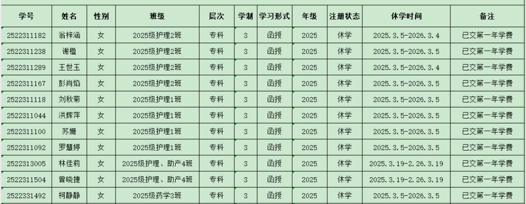 翁梓涵、謝楹11名高等學(xué)歷繼續(xù)教育學(xué)生因哺乳期反復(fù)發(fā)熱等原因,申請休學(xué)。根據(jù)《福建衛(wèi)生職業(yè)技術(shù)學(xué)院高等學(xué)歷繼續(xù)教育學(xué)生學(xué)籍管理規(guī)定》(閩衛(wèi)院繼〔20252號文)第章第三十四條的有關(guān)規(guī)定,經(jīng)研究,擬同意翁梓涵、謝楹11名高等學(xué)歷繼續(xù)教育學(xué)生休學(xué),按照流程辦理。