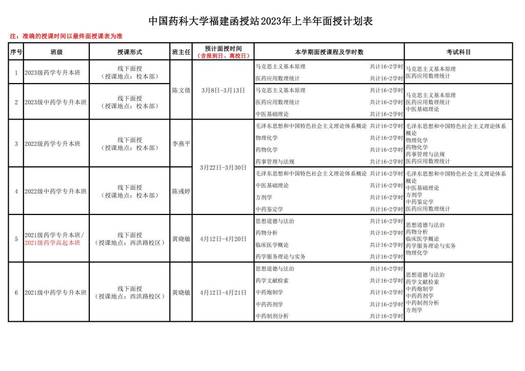中國藥科大學(xué)福建函授站2023年上半年面授計劃表(專升本/2021級高起本)