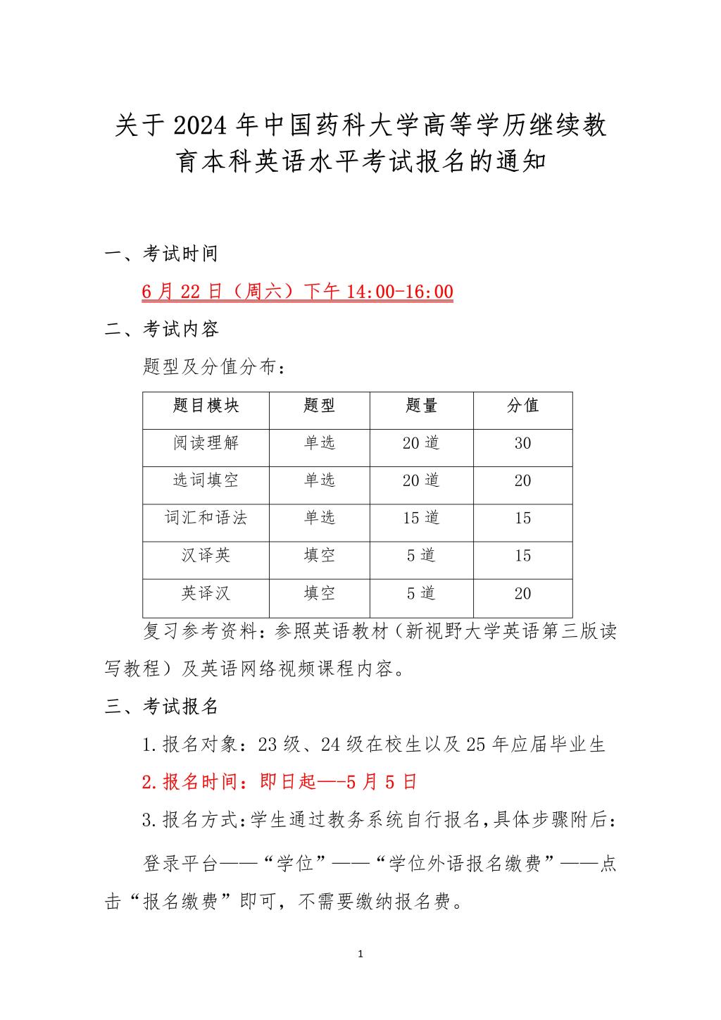 關(guān)于2024年中國藥科大學(xué)高等學(xué)歷繼續(xù)教育本科英語水平考試報(bào)名的通知