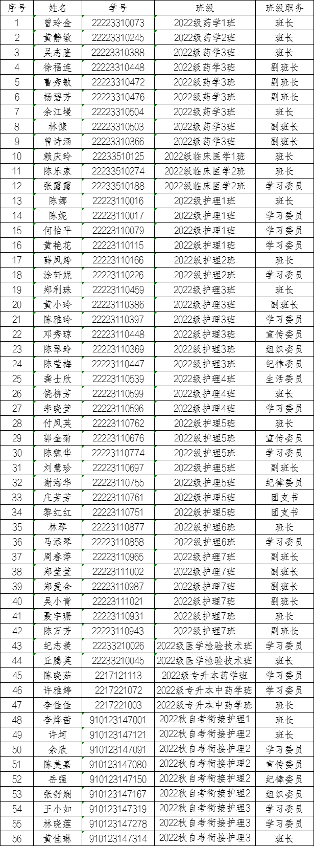 根據(jù)《福建衛(wèi)生職業(yè)技術(shù)學(xué)院高等學(xué)歷繼續(xù)教育優(yōu)秀學(xué)生干部評(píng)選辦法》有關(guān)規(guī)定,經(jīng)對(duì)各專業(yè)符合條件的學(xué)生逐級(jí)審核,擬決定授予曾玲金等56名學(xué)生福建衛(wèi)生職業(yè)技術(shù)學(xué)院2024年高等學(xué)歷繼續(xù)教育“優(yōu)秀學(xué)生干部”稱號(hào)?,F(xiàn)將名單公示如下: