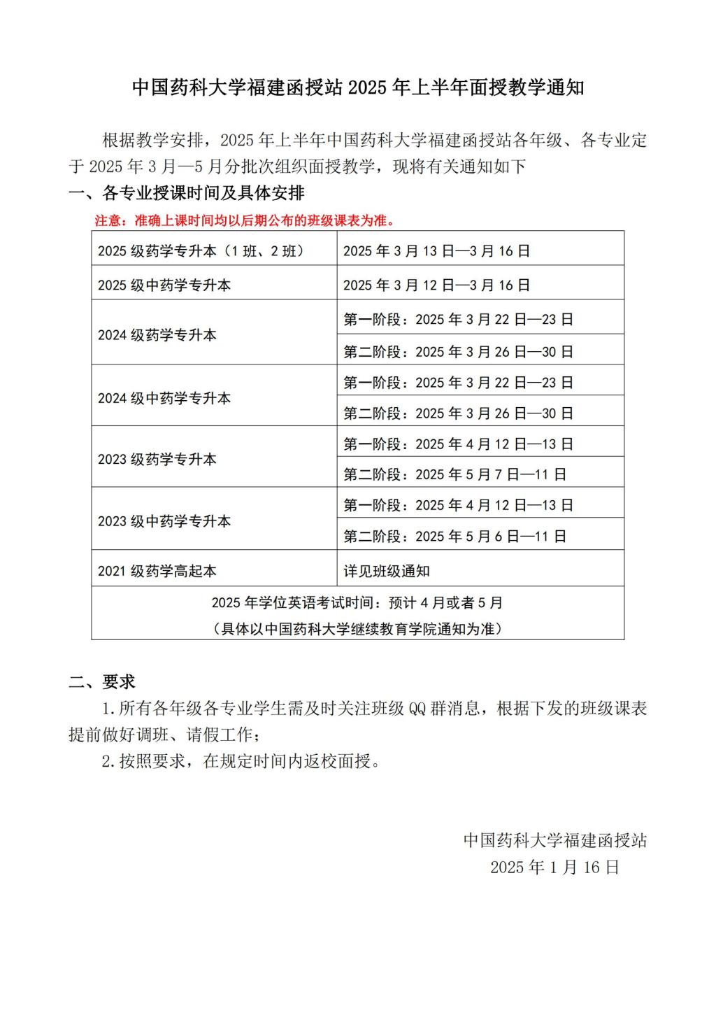 中國藥科大學(xué)福建函授站2025年上半年面授教學(xué)通知