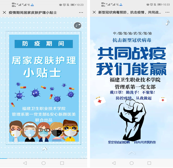 依托預(yù)防醫(yī)學(xué)教研室,利用專業(yè)優(yōu)勢,管理系第一黨支部在學(xué)院“天使之城”搭建抗擊新型冠狀病毒肺炎的線上課程資源——《新型冠狀病毒的個人防護(hù)與學(xué)校衛(wèi)生》,拍攝《戰(zhàn)疫我先行——閩衛(wèi)院開學(xué)“疫戰(zhàn)”第一課》,通過實時更新疫情動態(tài),傳授公共衛(wèi)生與安全知識,提高學(xué)生疫情防控能力。組織學(xué)習(xí)防疫阻擊戰(zhàn)中涌現(xiàn)的先進(jìn)事跡,弘揚社會美德,增強學(xué)生愛黨愛國愛人民愛社會主義的思想情感,將課程思政融入到疫情防控的每一個落腳點。