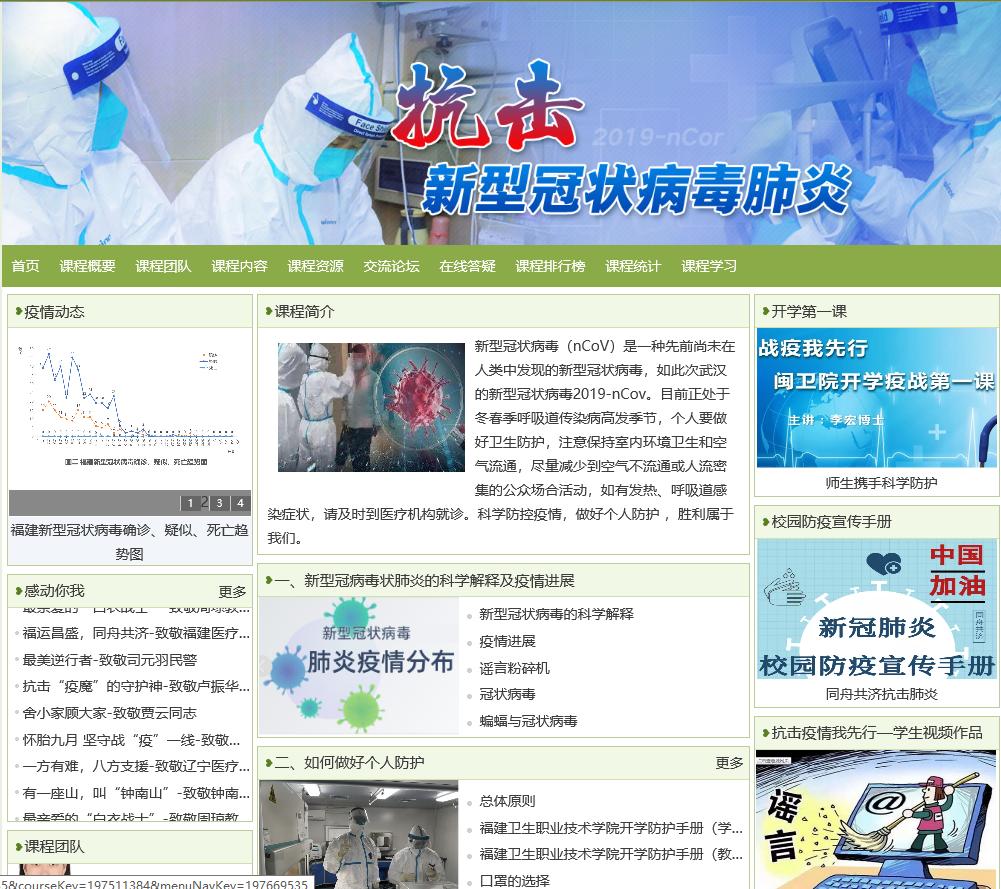 為貫徹落實教育部“課程學(xué)習(xí)與疫情防控知識學(xué)習(xí)相結(jié)合,特別注重疫情防護知識普及,加強生命教育、公共安全教育和心理健康教育”工作指示,福建衛(wèi)生職業(yè)技術(shù)學(xué)院管理系黨總支第一黨支部教師黨員聯(lián)合預(yù)防醫(yī)學(xué)教研室,利用預(yù)防醫(yī)學(xué)專業(yè)優(yōu)勢,面向校內(nèi)學(xué)生,在學(xué)院“天使之城”學(xué)習(xí)空間開設(shè)《抗擊新型冠狀病毒肺炎》網(wǎng)絡(luò)課程。