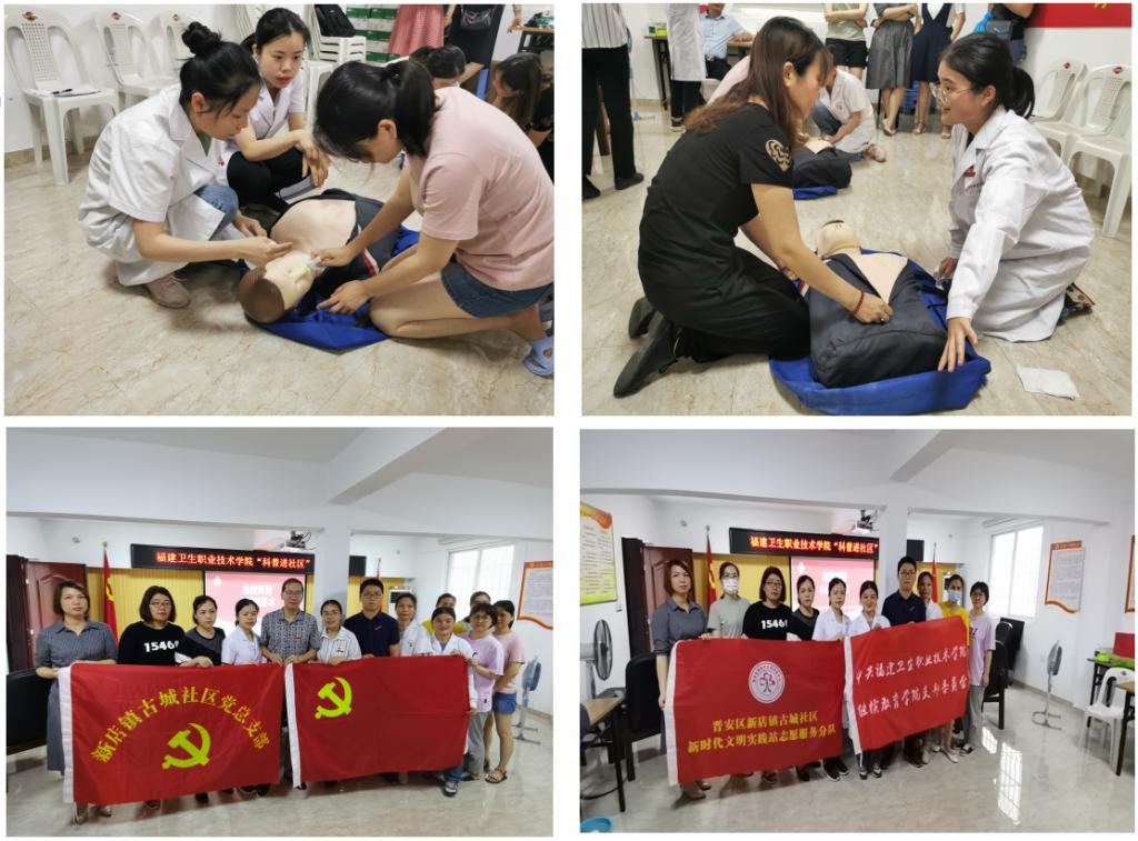 為扎實(shí)推進(jìn)全民科學(xué)素質(zhì)行動(dòng),弘揚(yáng)科學(xué)精神,普及科學(xué)知識(shí)及醫(yī)學(xué)急救常識(shí),2021年5月27日,福建衛(wèi)生職業(yè)技術(shù)學(xué)院繼續(xù)教育學(xué)院黨支部、醫(yī)學(xué)系第三黨支部、中醫(yī)教研室、質(zhì)量管理辦公室黨支部聯(lián)合開展“科普進(jìn)社區(qū)”——心肺復(fù)蘇技能培訓(xùn)活動(dòng),在晉安區(qū)新店鎮(zhèn)古城社區(qū)向居民普及醫(yī)療急救知識(shí)和現(xiàn)場處置能力,提高居民應(yīng)急意識(shí)、知識(shí)和技能,讓更多居民在家門口就可以學(xué)到應(yīng)急救護(hù)技能。